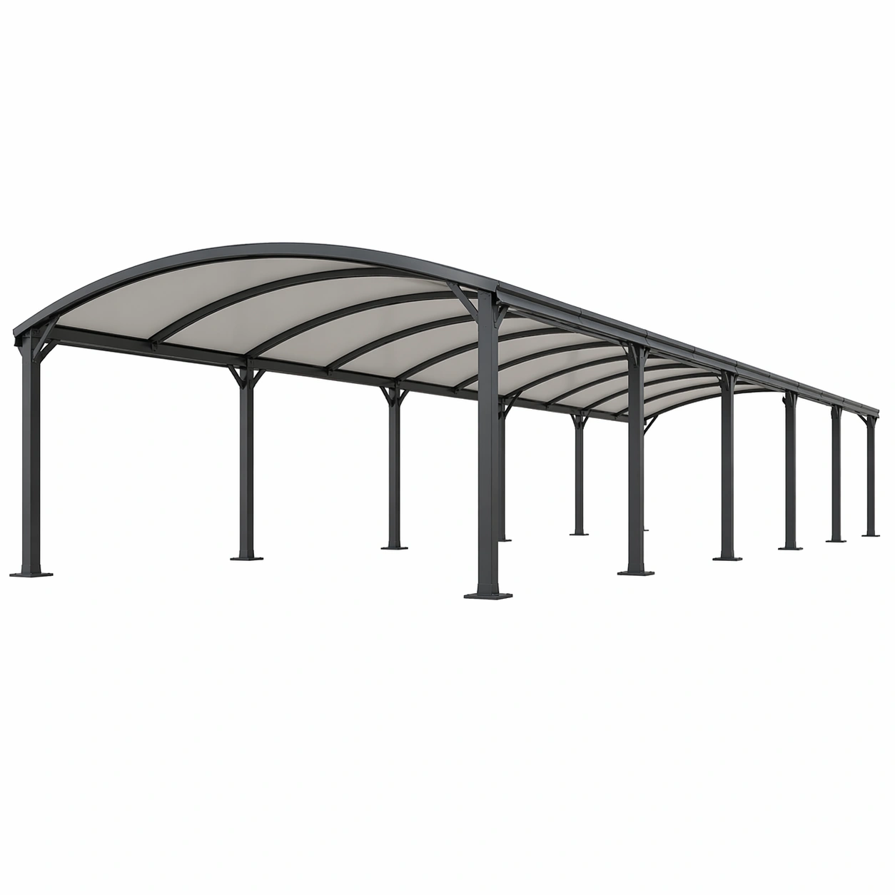 Das Carport besteht aus Polycarbonat-Dachpaneelen und einem verzinkten Stahlrahmen. Die Gesamtgröße beträgt 300 cm in der Breite, 1200 cm in der Länge und 300 cm in der Höhe. Die Farbe ist Schwarz. Das Gesamtgewicht liegt bei 750 kg mit einer maximalen Belastungskapazität von 1000 kg.