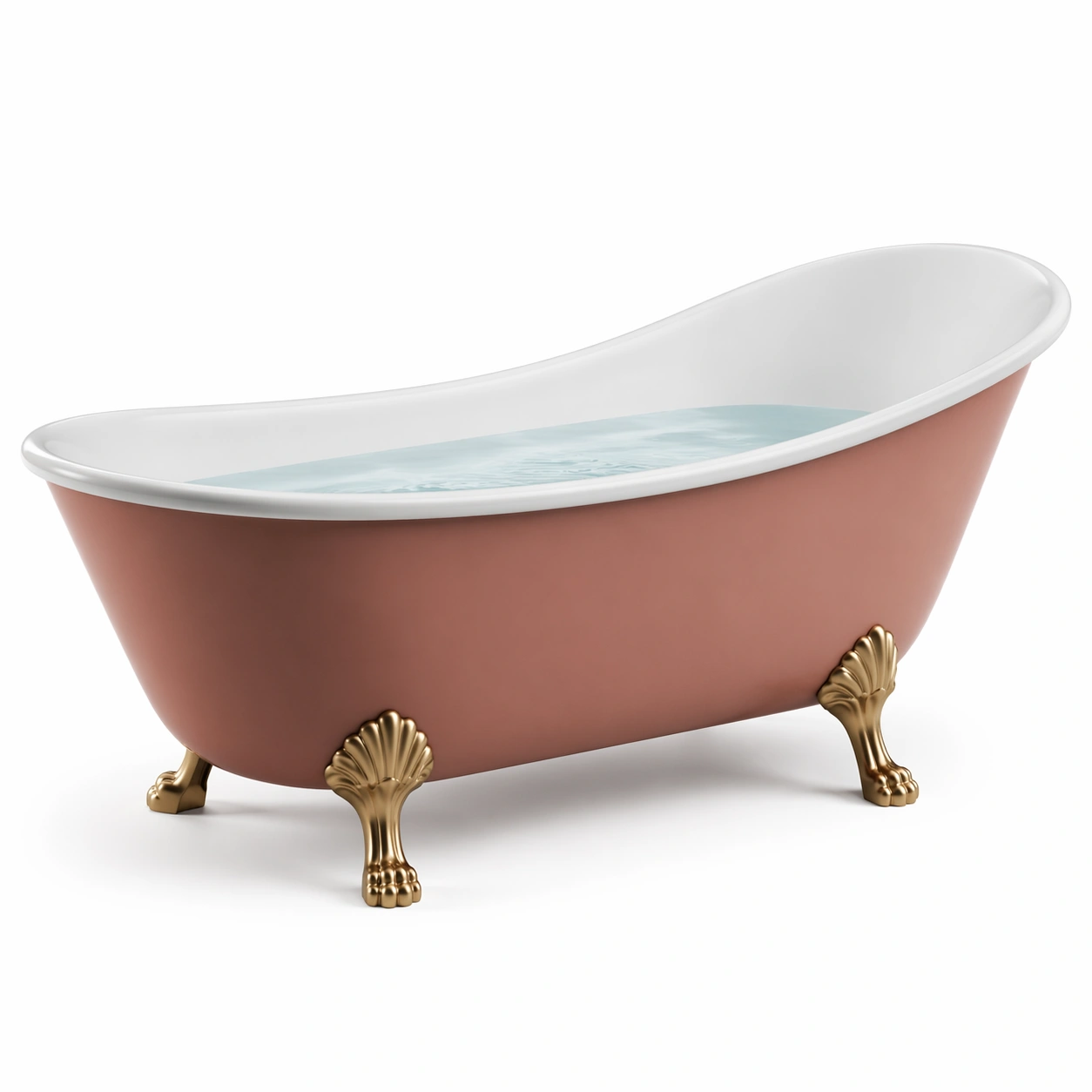 Die freistehende Badewanne besteht aus Acryl und besitzt messingbeschichtete Füße. Sie ist außen in Rosa und innen in Weiß gehalten. Die Abmessungen der Wanne sind 170 cm in der Länge, 75 cm in der Breite und 78 cm in der Höhe mit einem Fassungsvermögen von ca. 200 Litern. Das Gesamtgewicht beträgt 45 kg.