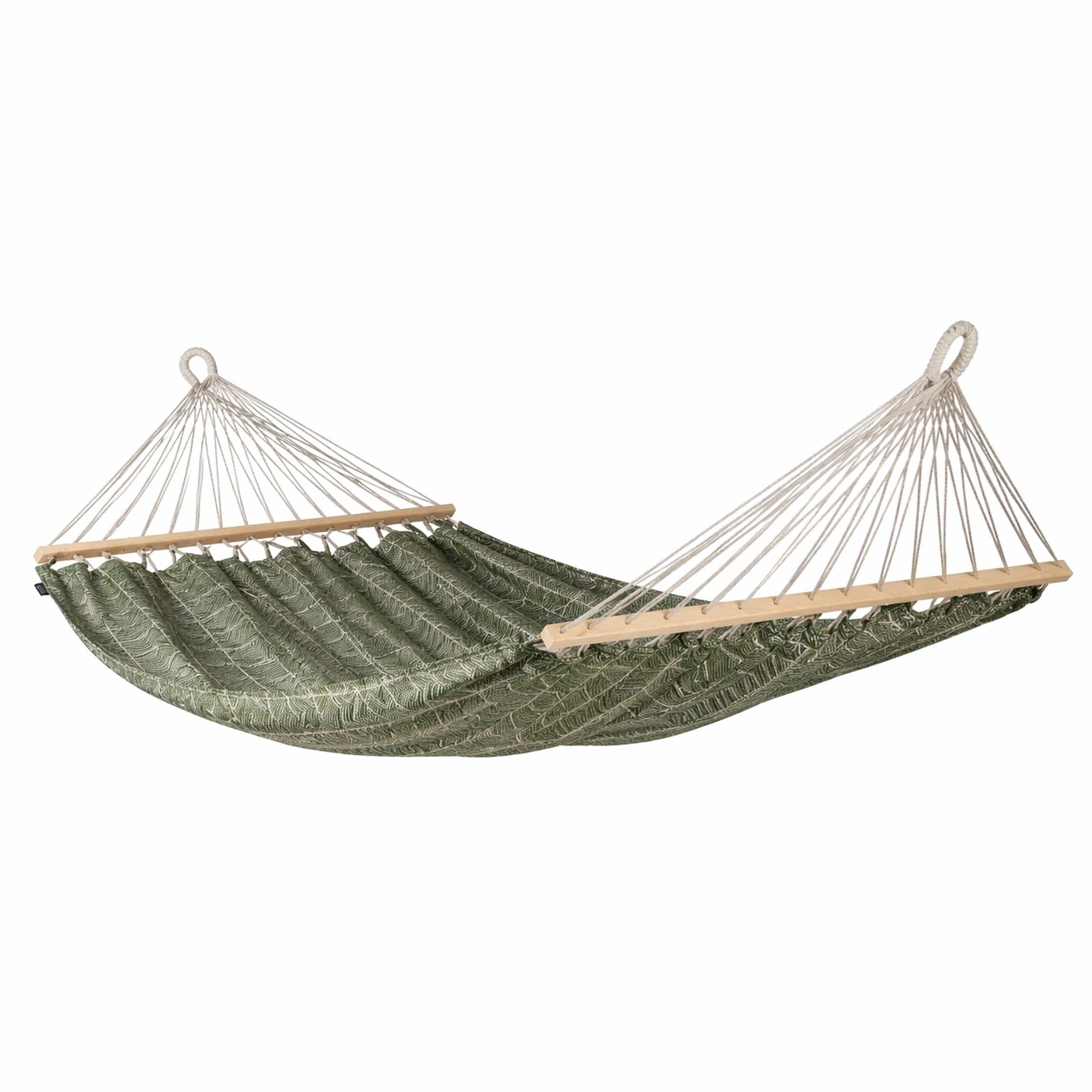 Diese Hängematte besteht aus einer Mischung aus Baumwolle und Polyester. Die Holzstäbe bieten zusätzliche Stabilität und erleichtern das Aufhängen. Die Gesamtgröße beträgt 200 cm in der Länge. Maximale Tragkraft: 150 kg.