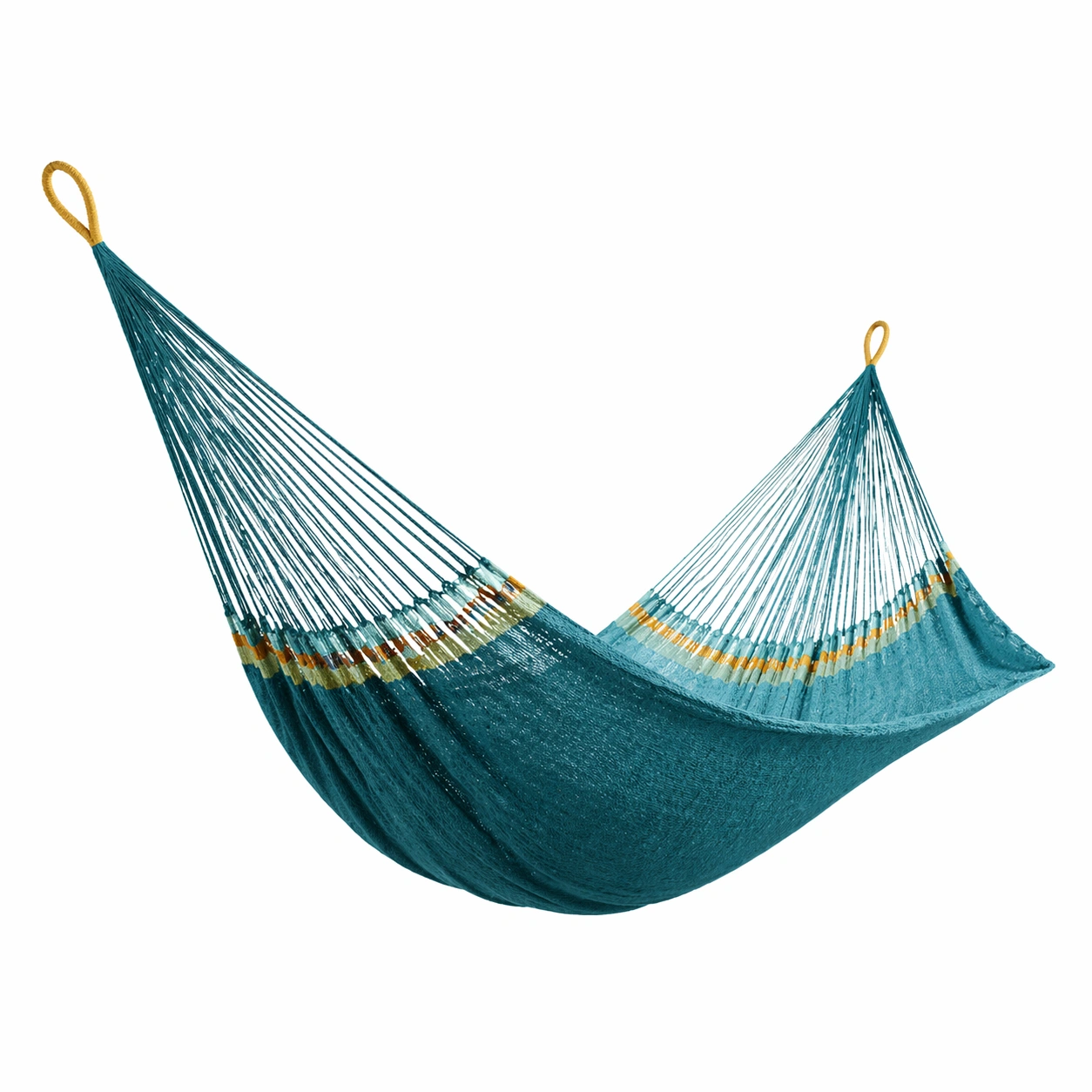 Diese Hängematte besteht aus strapazierfähigem Textilgewebe in Türkis. Die Gesamtlänge beträgt 200 cm und die Breite 150 cm.