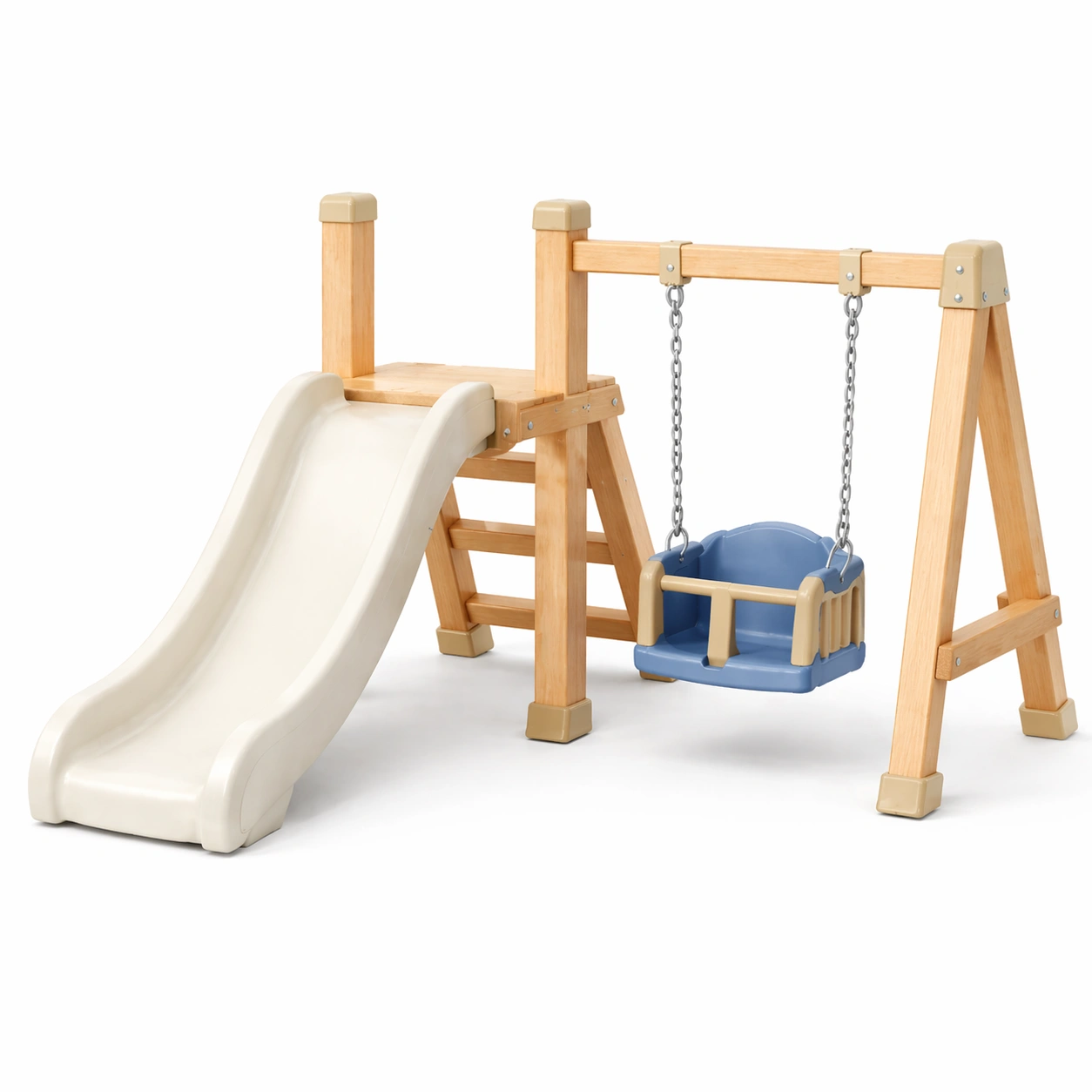 - Holz Natur, Rutsche in Weiß, Schaukel in Blau