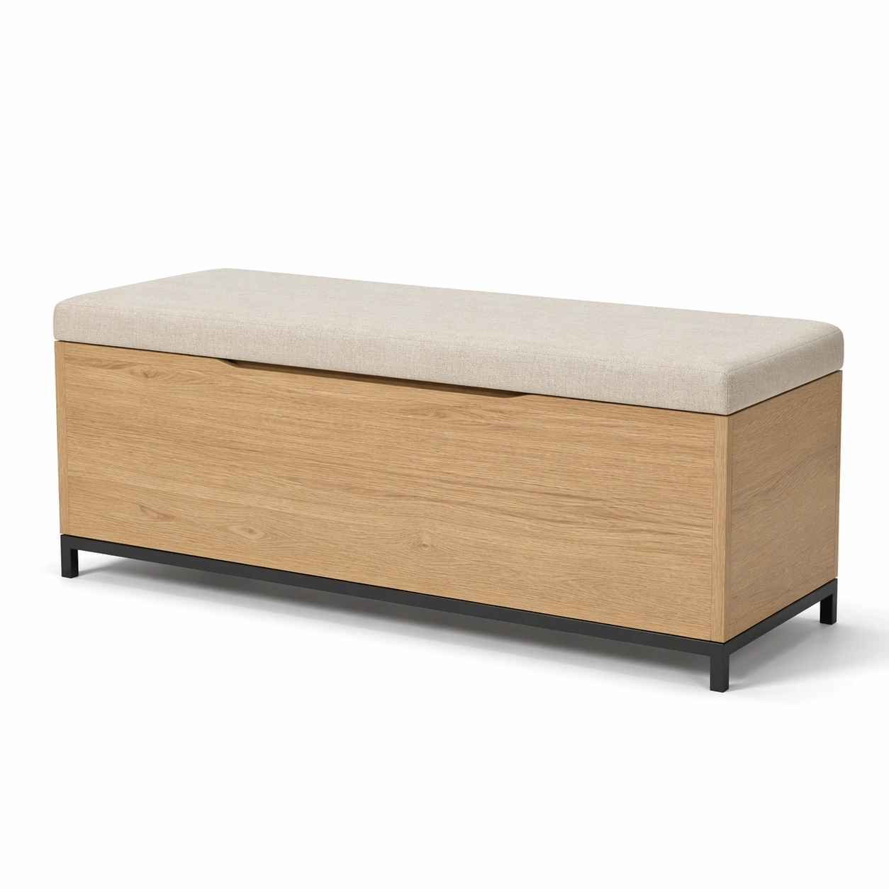 Diese Sitzbank bietet eine Sitzgelegenheit mit zusätzlichem Stauraum. Das Gestell besteht aus Eichenholz, während der gepolsterte Sitz mit strapazierfähigem Polyesterstoff bezogen ist. Die beige Farbe passt zu verschiedenen Wohnstilen.