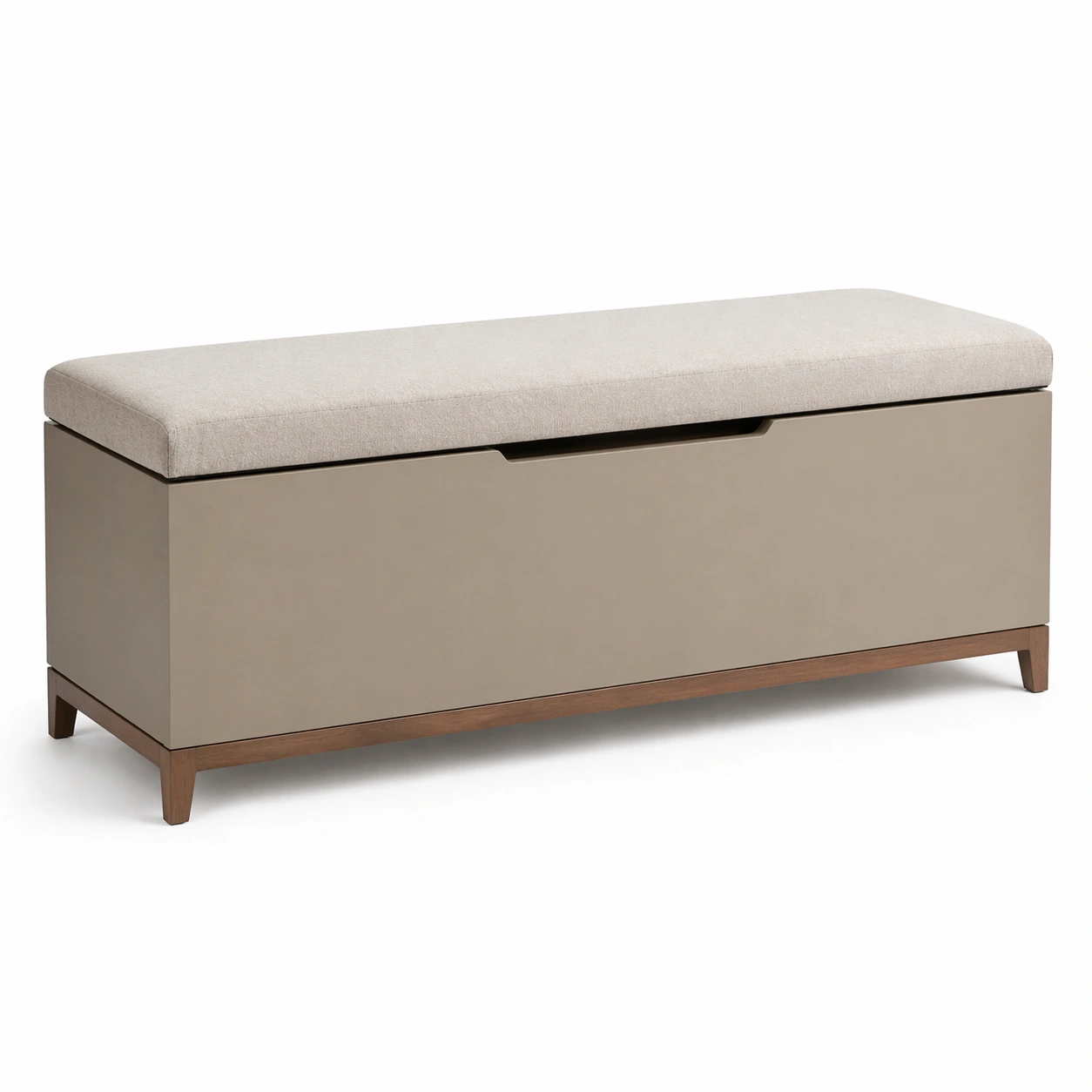 Diese Sitzbank bietet sowohl Sitzgelegenheit als auch Stauraum. Der Rahmen besteht aus Holz, und die Sitzfläche ist mit strapazierfähigem Polyestergewebe bezogen. Geeignet für Innenräume.